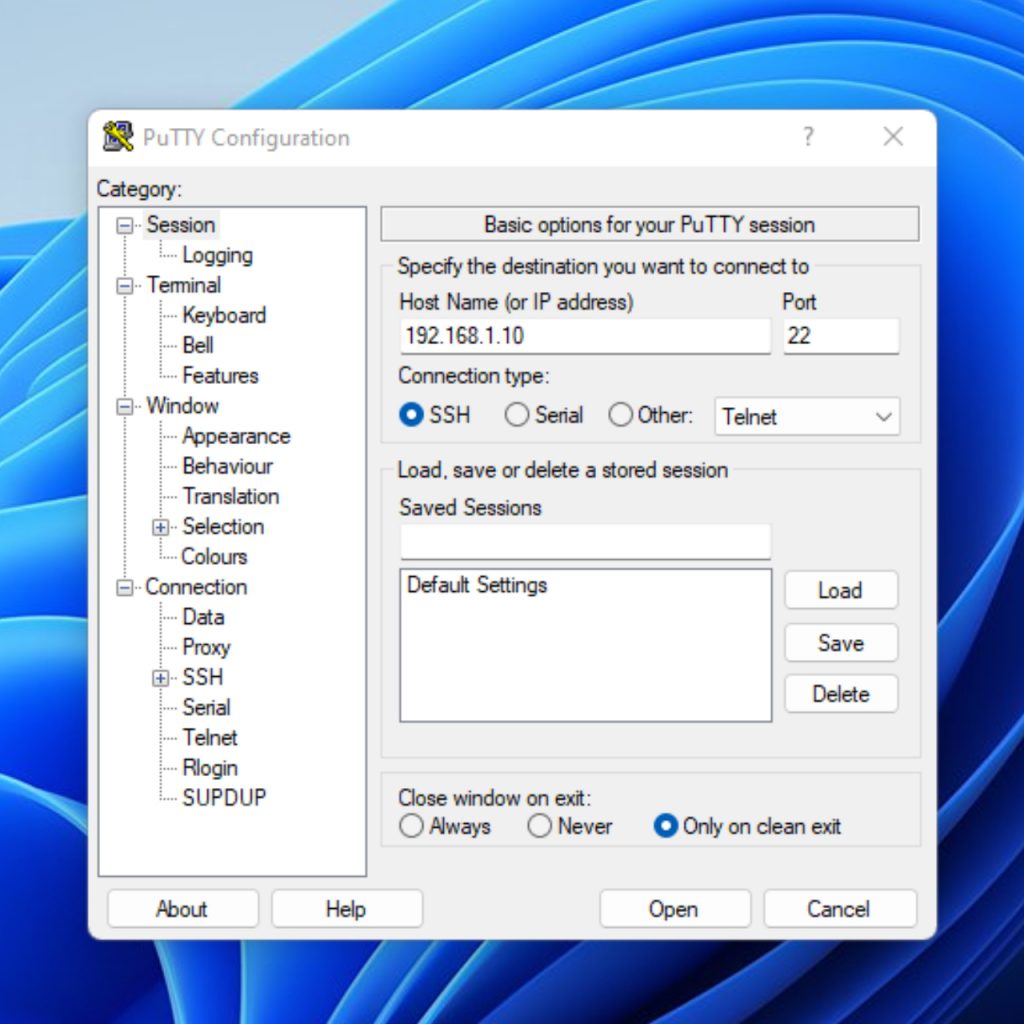 To get started open up your favorite terminal and connect to your AP via SSH. I will be using PuTTy. In the “Host Name” field put in the IP address of your AP. Make sure that “SSH” and “Telnet” are selected and that you are using Port 22, then press “Open”. Look at the screenshot below for reference.
