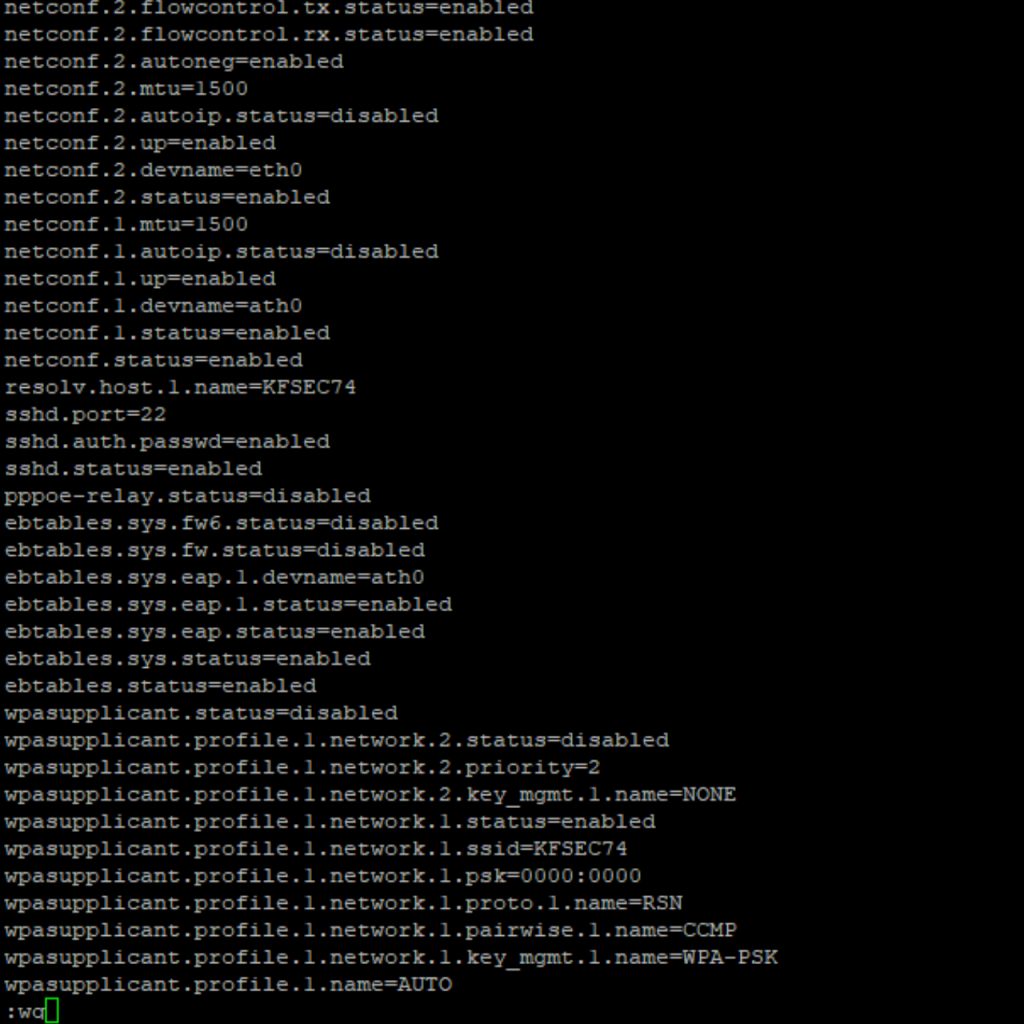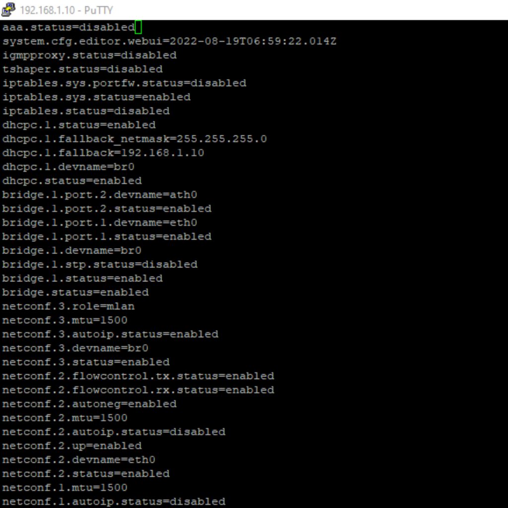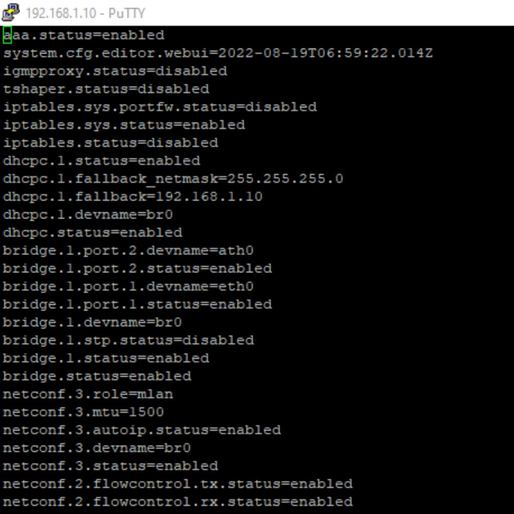 Once you’ve opened up the system config you’re going to see a wall of text. Each one of these paragraphs control a specific part of the AP’s configuration. The one we are looking for is “aaa.status=enabled”. We are going to change that you be “aaa.status=disabled. To do this press the “A” or “I” key on your keyboard to enter edit mode. You can move your cursor around with the arrow keys. Simply backspace or delete the word “enabled” and replace it with the word “disabled”. The paragraph should now look like this: